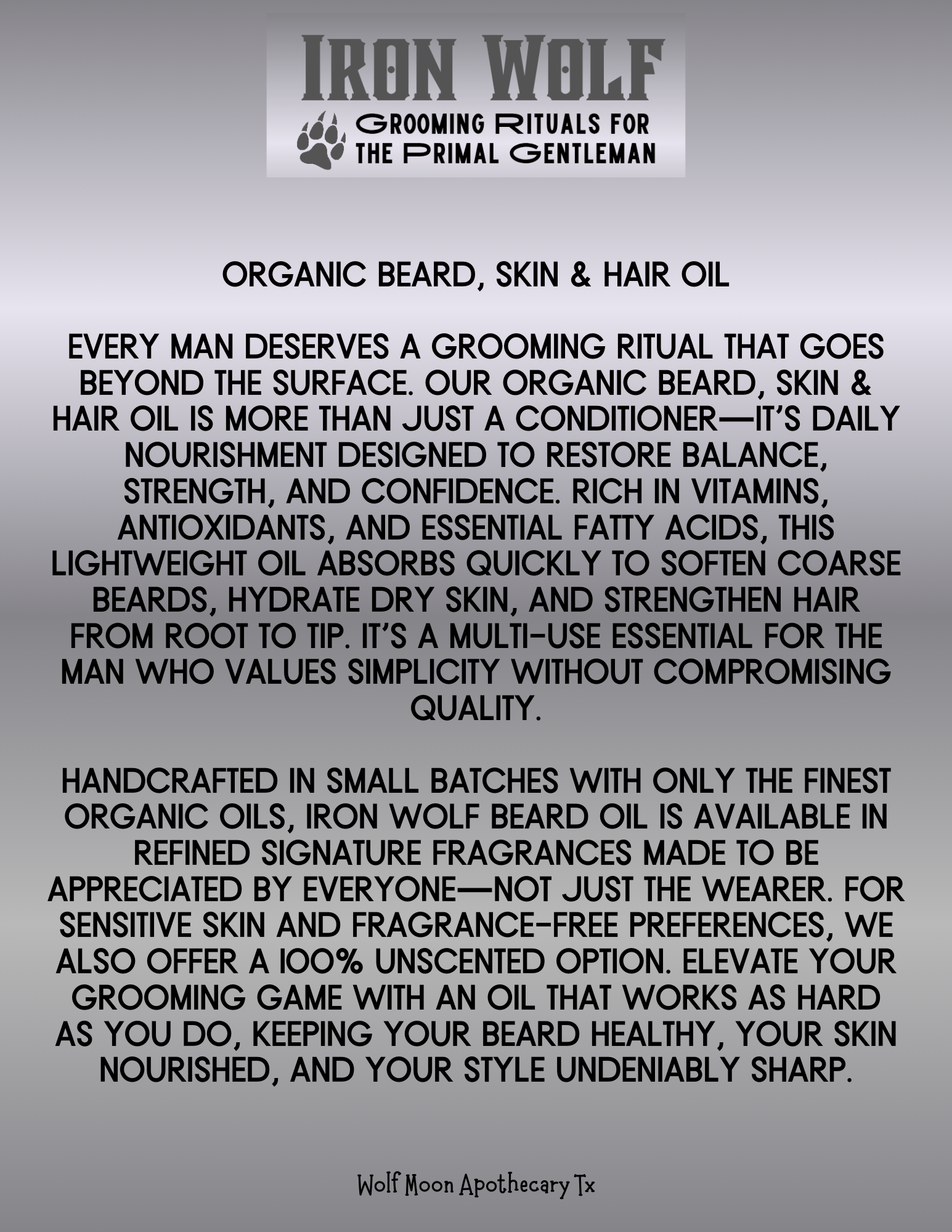 Handcrafted in small batches with only the finest organic oils, Iron Wolf Beard Oil is available in refined signature fragrances made to be appreciated by everyone—not just the wearer. For sensitive skin and fragrance-free preferences, we also offer a 100% unscented option. Elevate your grooming game with an oil that works as hard as you do, keeping your beard healthy, your skin nourished, and your style undeniably sharp.