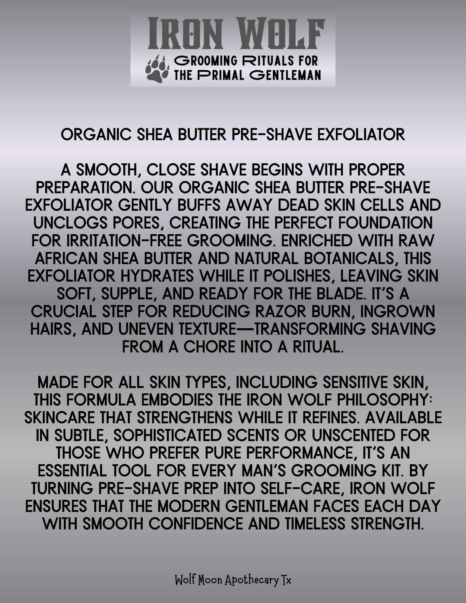 Made for all skin types, including sensitive skin, this formula embodies the Iron Wolf philosophy: skincare that strengthens while it refines. Available in subtle, sophisticated scents or unscented for those who prefer pure performance, it’s an essential tool for every man’s grooming kit. By turning pre-shave prep into self-care, Iron Wolf ensures that the modern gentleman faces each day with smooth confidence and timeless strength.